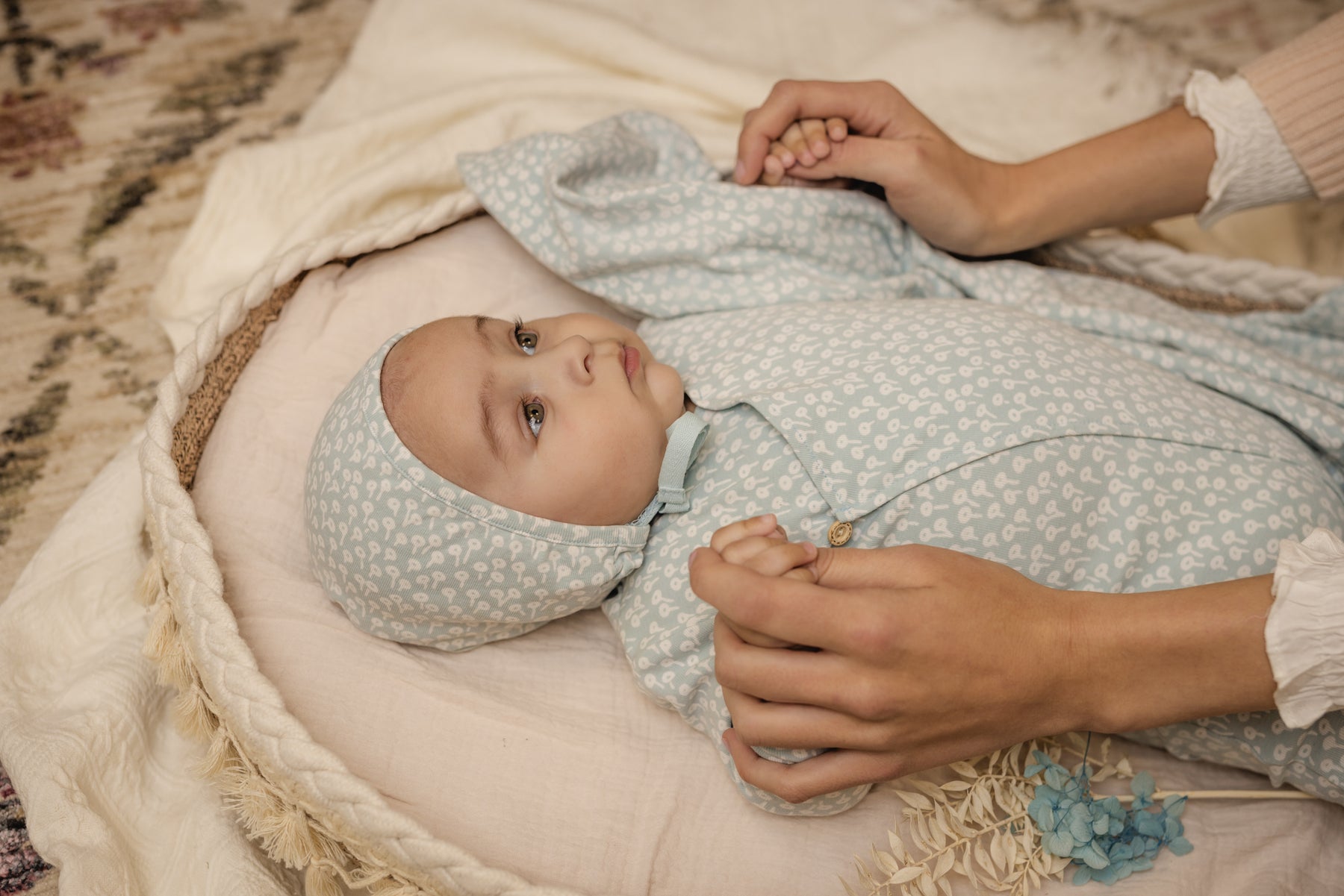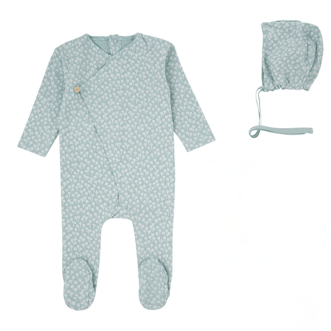 Bondoux Bebe Bud Print Collection Blue Cotton Footie with Bonnet