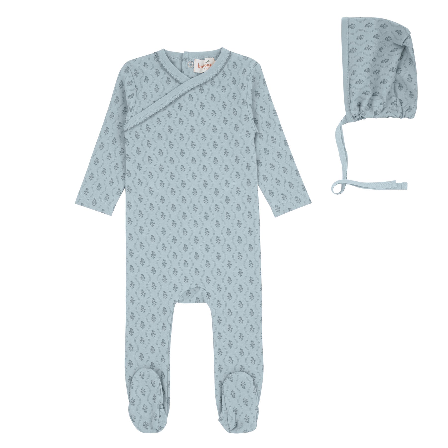 Bondoux Bebe Scallop Print Collection Blue Cotton Footie with Bonnet